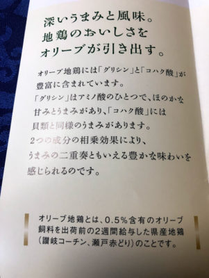 香川県にある「オリーブ地鶏振興協会」の出しているパンフレット、オリーブの搾りかすを餌に混ぜて鶏さんに食べさせているらしい。