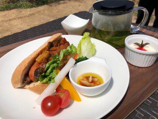 これに地元の農家さんで採れた季節のお野菜のバーニャカウダ、オリーブ畑直送のオリーブ生茶、デザートまでつけちゃう。バーニャカウダソースだってこだわりの一品、ニンニクは全国2位の生産量を誇る香川県産、そこに本来はアンチョビを使うのを小豆島産のお醤油を使っちゃうのだ。アンチョビってお魚なんで人によってはあの匂いが苦手なこともあるけど、お醤油のバーニャカウダだと小さな子供も含めてみんなおいしいって食べてくれる。オリーブ生茶は畑で今採れたオリーブの葉っぱで煎れるから、フレッシュそのもの。