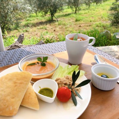 ランチメニューも夏バージョン、自家農園で採れたトマトやパプリカで作ったスペインの冷たいスープ「ガスパチョ」この暑い夏に合わせてシェリービネガーの強い酸味を効かせてさっぱり味に。合わせて頂くのは鶏肉のリエット、この暑い中、灼熱の厨房で店主が汗だくになって炒めたタマネギの自然な甘さだけで味を作った自信作。焼きたてのパンはガスパチョにつけたり、リエットを載せたりご自由に。