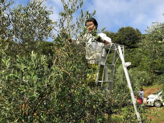 理想的な収穫ということになると、「ひとつづつ手で摘む」ということになります。大変な手間なんですが、これだと一切実に傷がつかないので、酸化を抑えるには理想的な方法です。私たちをはじめ、香川県の国産オリーブオイルの生産者はみんなこのようにして手間をかけて収穫しています。だから、酸度が0.2%台という低い数値を実現できるんです。